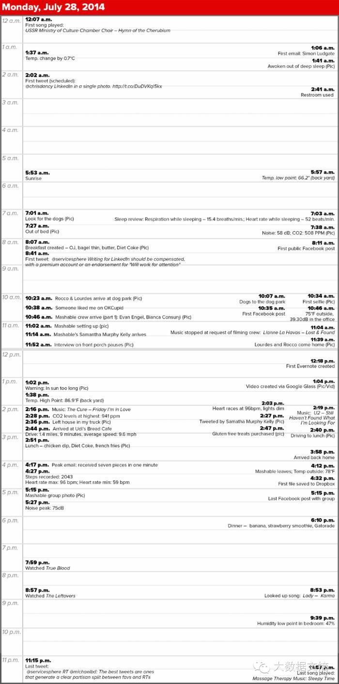 Dancy谈到,“很多人都在好奇未来他们是否会像我一样生活,而实际上,大家的生活方已经和我如出一辙了,只不过大家不这么去想而已。”他指出,“你的手机上已经存储了关于你本人、你的生活的一系列信息。如果你使用信用卡、或者GPS汽车导航,那么你(的消费记录、出行记录)就已经被跟踪记录了。当然,监控者是国家政府(Big Brother)。如果你选择自己来监控、分析这些信息的话,就像是更为贴心的家庭监控系统(Big Mother),减少了控制感,更多的,是对自身的优化调节。”