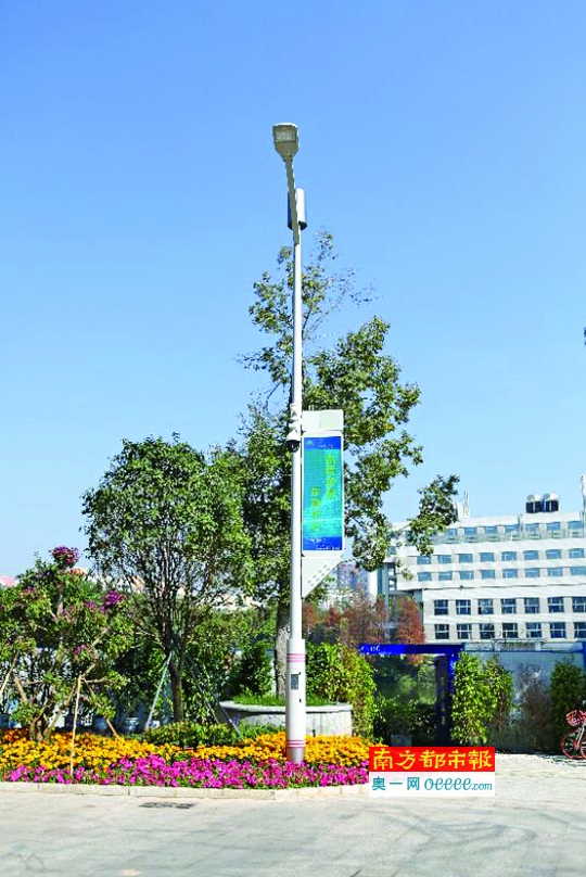 龙岗智慧公园集视频监控、噪音监测、P M2 .5监测、公共WIF I服务、报警、播放视频功能一体的智慧路灯。