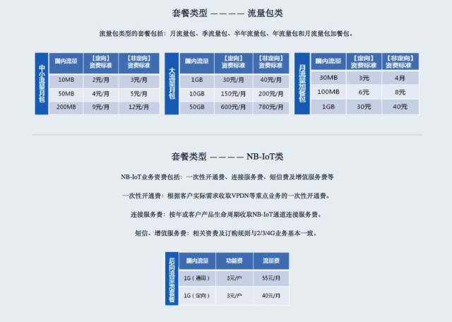 而中国电信物联网套餐则分为非定向及定向流量,资费为定向流量从2元/月至600元/月不等,流量从10M/月到50G/月不等。非定向流量为从3元/月至780元/月不等,流量从10M/月到50G/月不等。