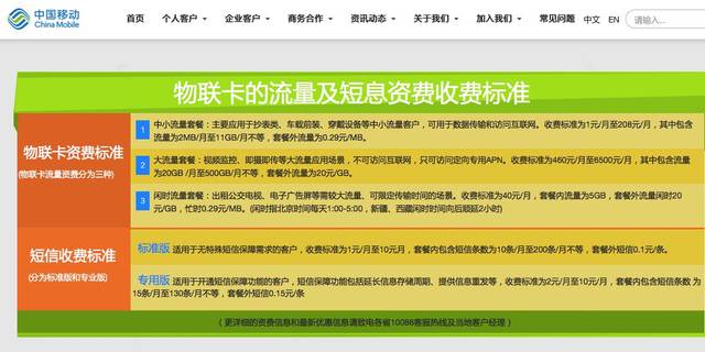 据运营商官网信息显示,中国移动物联网卡资费为1元/月至208元/月,流量为2M/月至11G/月,套餐外流量为0.29元/M。