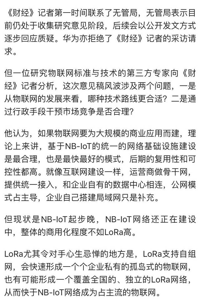 由于NB-IoT技术无需组网不受约束,无管局的意见稿一时被解读为政府力挺NB-IoT利益方。LoRa支持者们除了明面上质疑“政府干预市场竞争”,私底下向《财经》记者暗示,“华为在背后搞鬼”,但有第三方物联网专家告诉《财经》记者,技术本身虽无绝对优劣之分,但NB-IoT和LoRa两种技术产业链谁强谁弱,很可能关系到中国物联网产业走向,政府有其长远考虑。