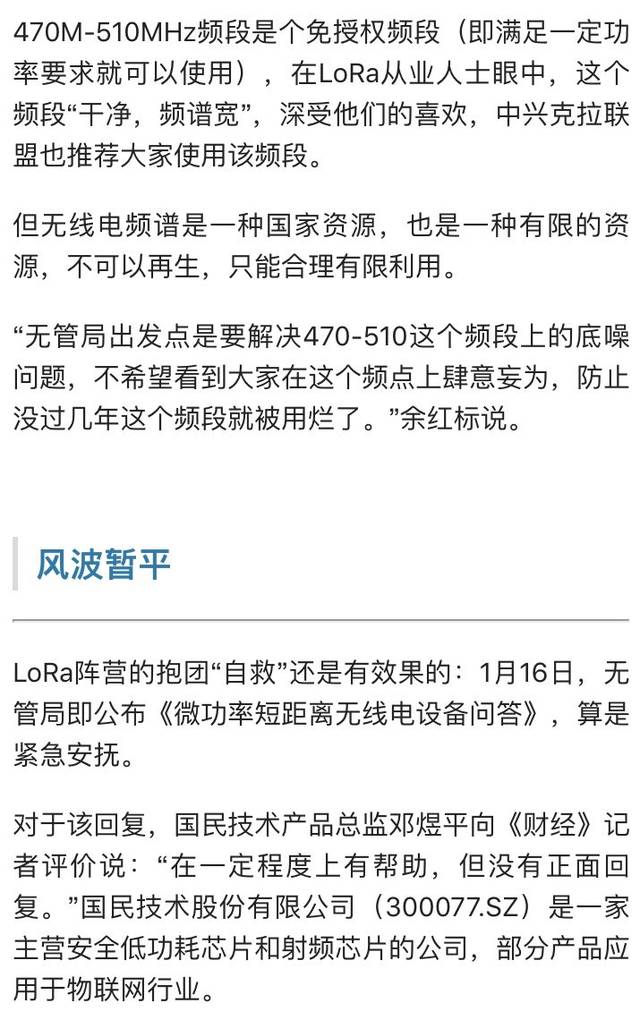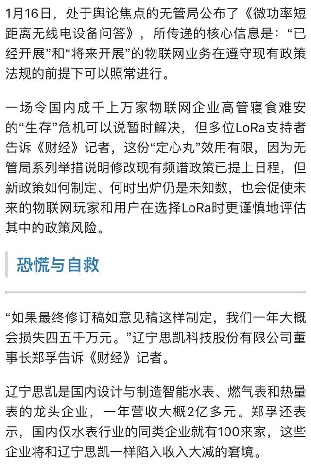 中兴克拉是中国最大的LoRa产业联盟,由中兴通讯于2016年1月发起成立,目前正式成员超过1000家。该联盟某主要成员单位的一位总经理告诉《财经》记者,他在2017年还和无管局专家交流过,“当时聊得挺好,但没有想到会最终出这么一个文件”。
