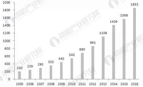 2005-2016年我国智能建筑行业市场规模(单位:亿元)