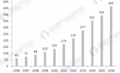2006-2016年我国居住智能建筑市场规模(单位:亿元)
