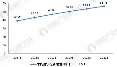 通过对比美国和日本智能建筑的发展历程,预计未来我国智能建筑在新建建筑中的比例仍将保持每年3.5个百分点左右的提升速度,到2022年,我国智能建筑在新建建筑中的比列有望达到57%左右。