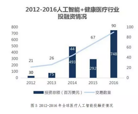 据统计,到 2025 年人工智能应用市场总值将达到 1270 亿美元,其中医疗行业将占市场规模的五分之一。我国正处于医疗人工智能的风口:2016 年中国人工智能+医疗市场规模达到 96.61 亿元,增长37.9%;2017 年将超过 130 亿元,增长 40.7%;2018 年有望达到 200亿元。投资方面,据 IDC 发布报告的数据显示,2017 年全球对人工智能和认知计算领域的投资将迅猛增长 60%,达到125亿美元,在2020年将进一步增加到 460 亿美元。其中,针对医疗人工智能行业的投资也呈现逐年增长的趋势。其中 2016 年总交易额为 7.48 亿美元,总交易数为 90 起,均达到历史最高值。