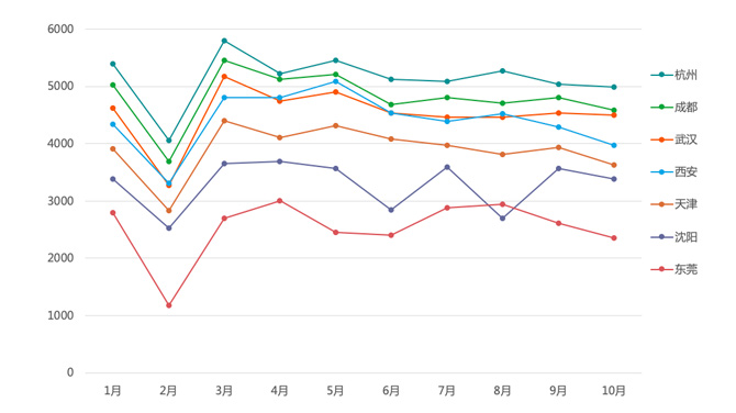 而分城市来看,15个新一线城市在1-10月的智慧城市搜索走势上几乎呈现出相同的走势。为了在图表上清晰展示,在此我们只从中国各地区中选择热度最高的城市作为代表,即华东的杭州、西南的成都、华中的武汉、华南的东莞等等。