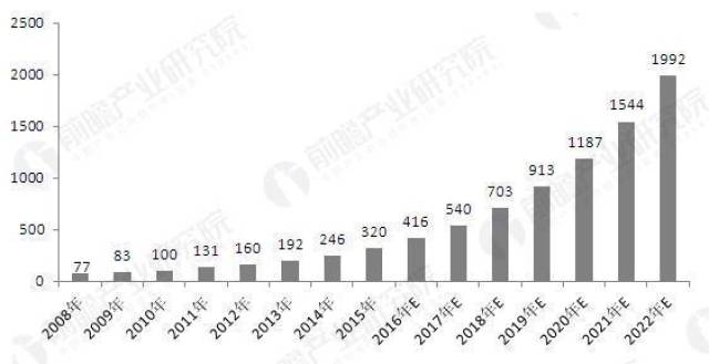 2008-2022年中国城市智能交通市场规模变化情况(单位:亿元)