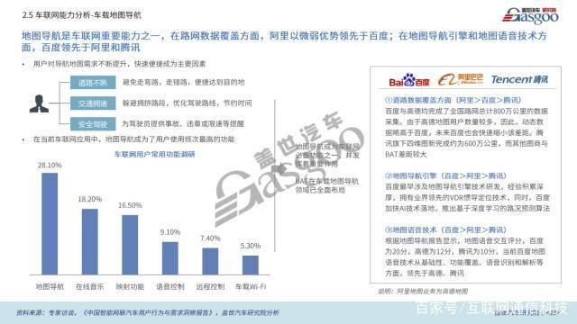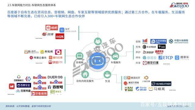 陈述从车载操作系统根底才能、地图导航、车载AI才能、云端才能,以及车联网生态五大方面对BAT三家车联网归纳实力进行评定。其间,百度在AI语音交互、地图导航引擎及地图导航语音技能等方面抢先;阿里在车载操作系统根底才能及地图导航路网数据方面较强;腾讯首要优势则首要表现在其生态才能上。