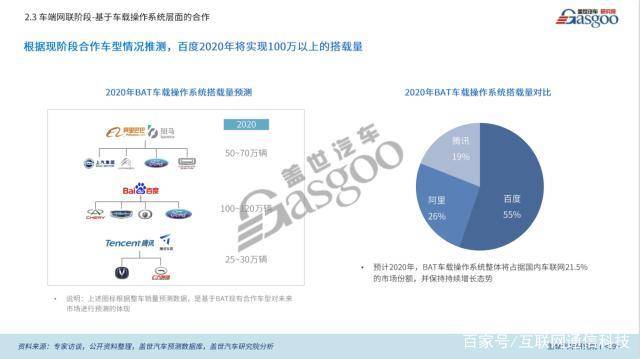 根据盖世轿车研讨院剖析指出,目前BAT与车企协作方法可分为单项或多项才能协作和根据车载操作系统层面的全体解决计划协作;经过车载操作系统层面的协作,BAT可获得丰厚的用户数据,一起也是最为抱负的协作方法。预计到2020年,BAT车载操作系统全体将占有国内车联网21.5%的商场比例,并保持持续增长态势。