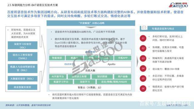 作为车载操作系统的重要组成部分,车载语音进口是BAT“必争之地”。根据陈述显示,百度凭借先发优势和技能堆集,在车载语音范畴处于抢先地位。百度将语音技能作为集团战略方向,从研发布局和底层技能等方面构建起了完好的AI系统,并依靠数据和技能堆集,使车载语音互动技能可满足多场景下的需求,一起支持免唤醒、多轮打断式交流、情感染表达等。依托百度堆集的强壮知识库和千亿级搜索数据,百度语音交互可满足车内各类场景需求和个性化服务。