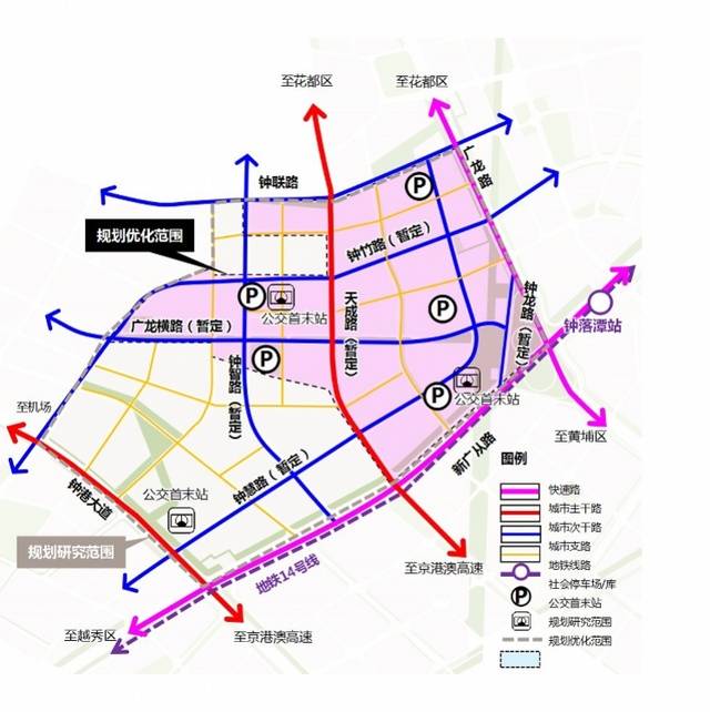 本次规划研究范围,东至广龙路,南至新广从路,西至钟港大道,北至钟联路,规划研究范围276公里。结合广龙地块土地储备进展顺利的130.7公顷一期收储范围,东北角11.98公顷已选址历史留用地及城市道路,划定本次规划规划优化范围117公顷。