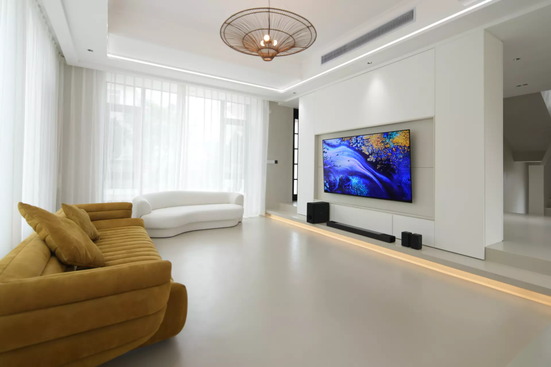 黄岚岚家大厅的智能灯光/受访者供图据杨震介绍,一般的全屋智能,包括灯控(控制灯的开和关)、灯光(指可调色温、亮度、颜色的灯具)、遮阳(包括智能窗帘)、安防(包括智能门锁、摄像头)、影音(包括智能音箱)五大系统,再加上智能家电,共六大部分。