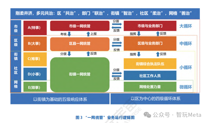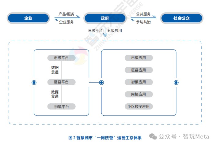 智慧城市“一网统管”运营生态体系主要体现“一网统管”运营主要参与方之间的关系,以及政府作为“一网统管”建设的主导者,为推进各层级政府部门实现统一运行、高效运转、协同联动而采取的“三级平台、五级应用”城市运行管理架构。