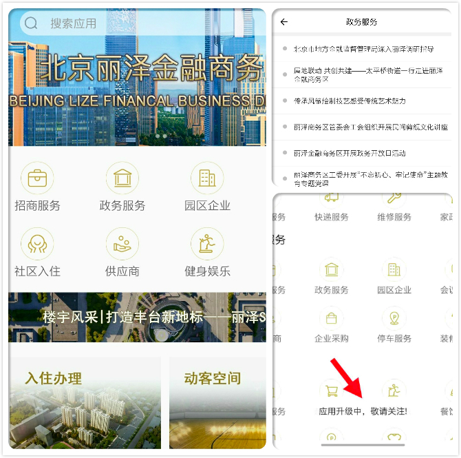 打开这款App,页面上有丰富的功能入口:招商服务、政务服务、社区入住、物业服务、停车服务……然而「甲子光年」点开这些功能,呈现的却是一篇篇介绍文章,或者干脆是“应用升级中”。