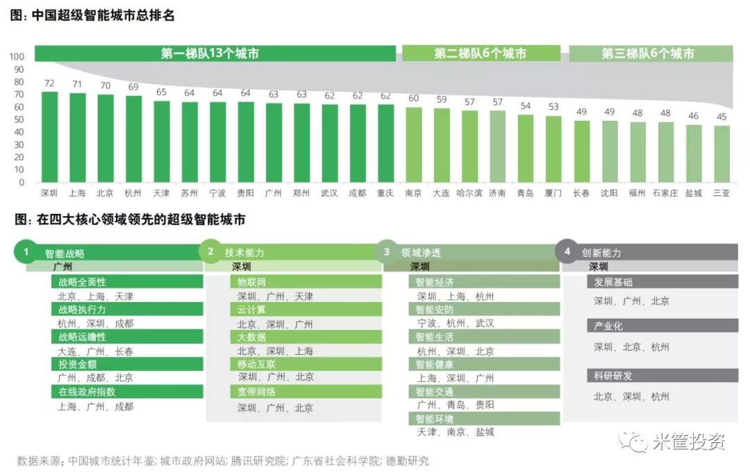 中部只有郑州、武汉上榜3、 值得注意的是,智慧城市的强弱一般与经济实力呈正相关,但也有例外比如第一梯队的贵阳,大数据的强劲发展使得其排名甚至超过了广州、武汉4、 第二梯队6个城市,南京、大连、哈尔滨、济南、青岛、厦门。