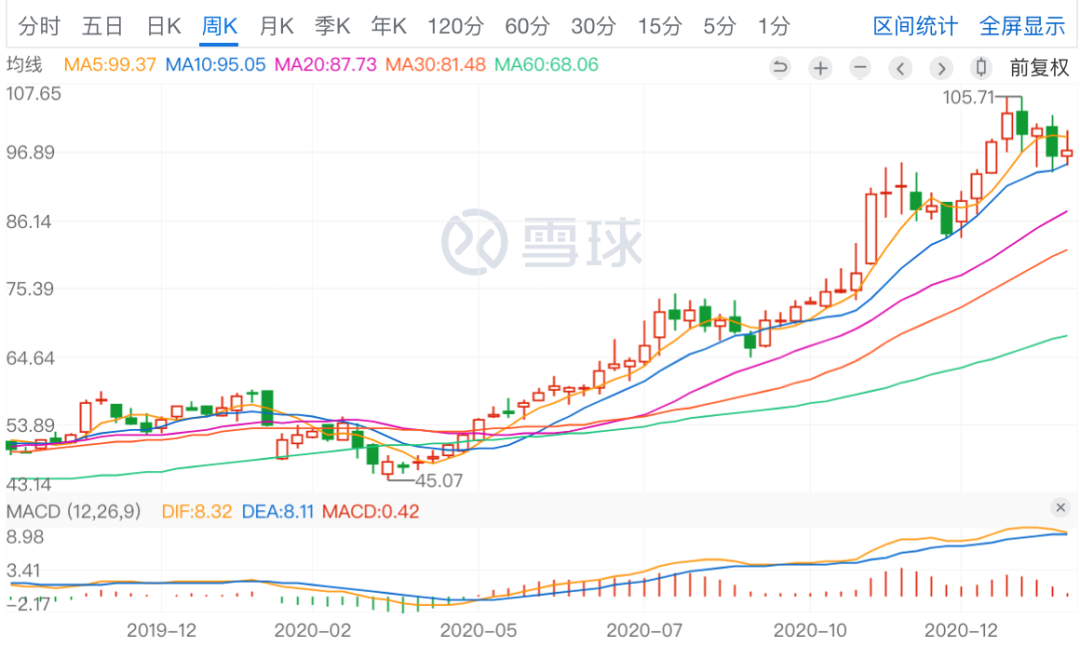 ,占比超过了家用电器行业总市值的三分之一(股价目前虽有所回落,但仍在百元附近震荡)。